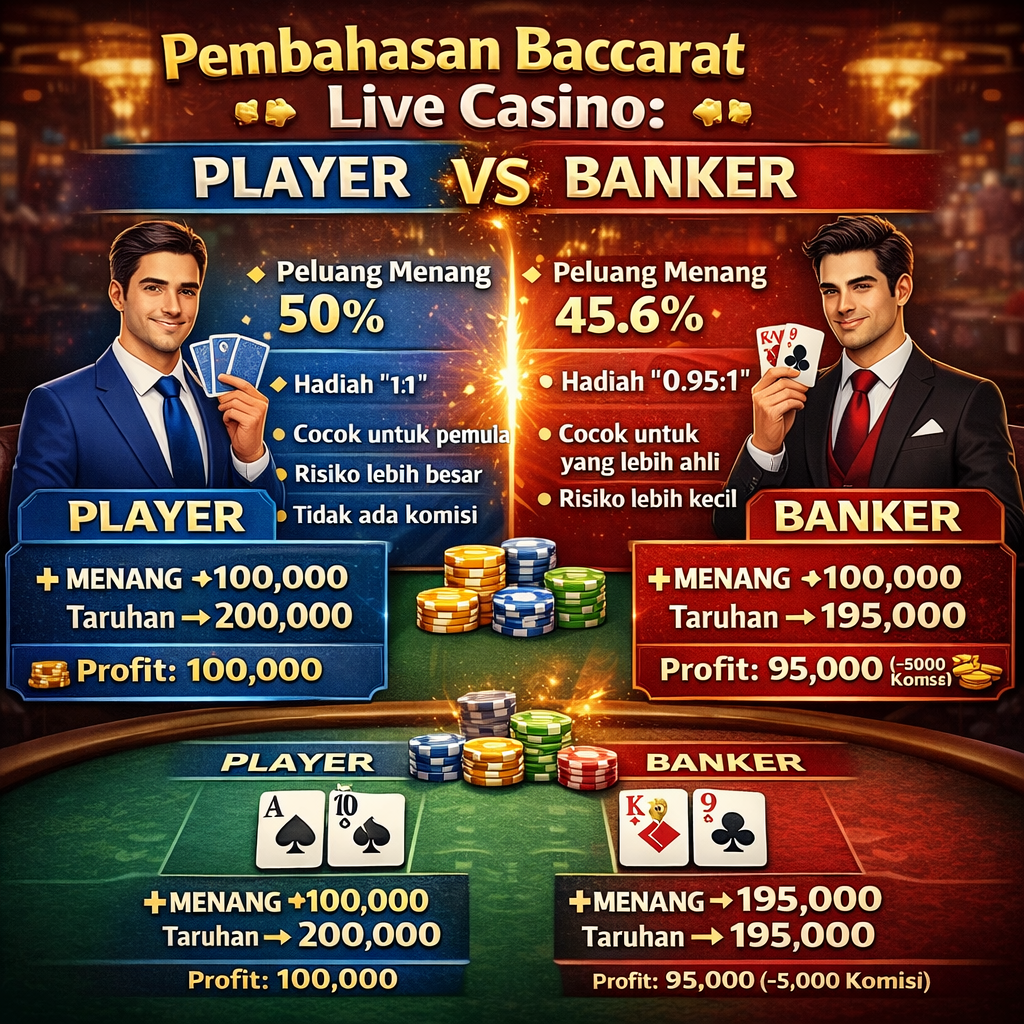 Salah satu pembahasan yang paling sering muncul dalam baccarat live casino adalah perbandingan antara taruhan Player dan Banker. Kedua pilihan tersebut memiliki prinsip permainan yang sama, namun secara statistik Banker sering dianggap memiliki peluang yang sedikit lebih stabil dibandingkan Player. Meski demikian, kemenangan pada taruhan Banker biasanya dikenakan komisi kecil sebagai bagian dari aturan permainan baccarat yang umum digunakan di berbagai platform live casino.